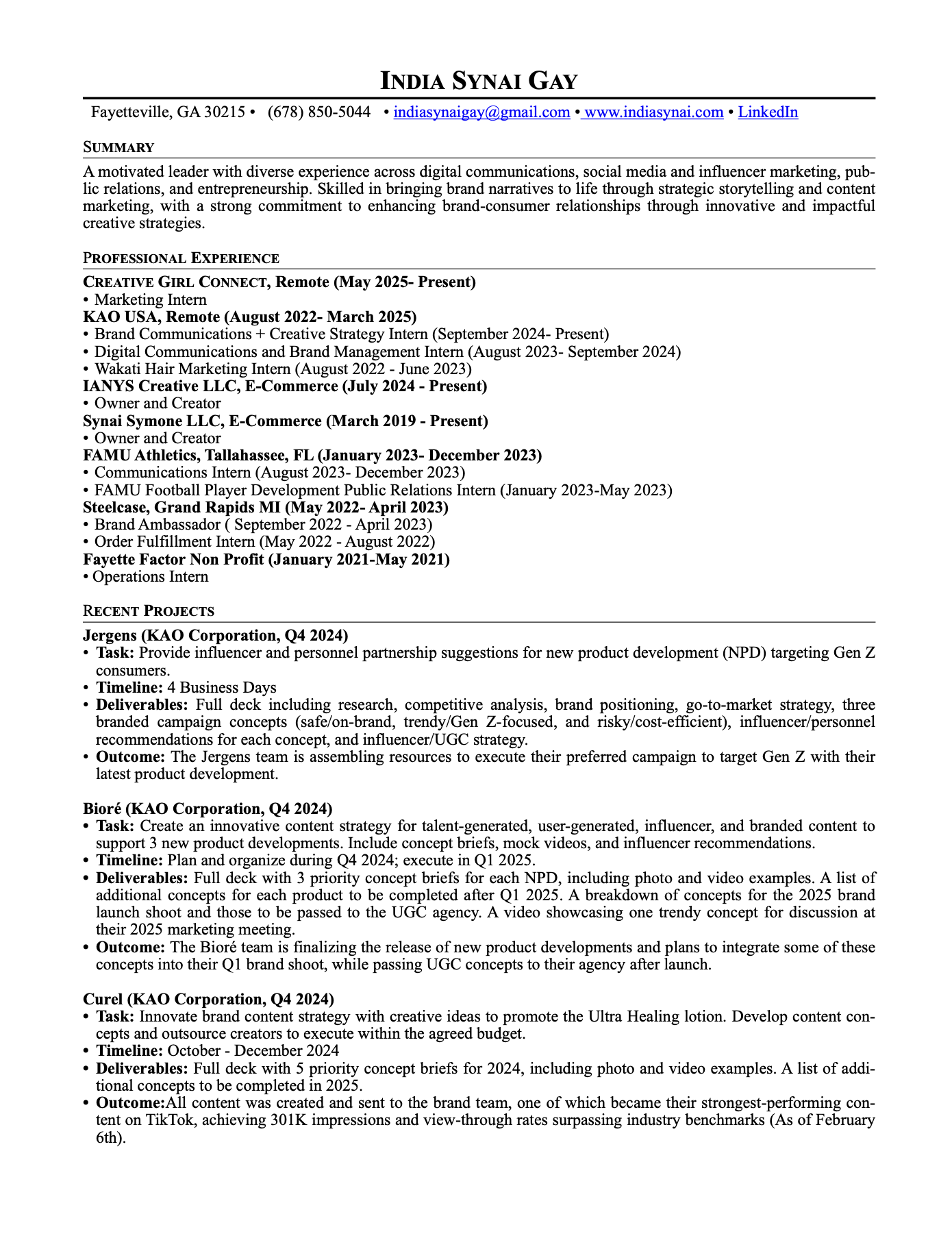 I am a motivated leader with diverse experience in digital communications, social media and influencer marketing, public relations, and entrepreneurship. With a strong ability to bring brand narratives to life through strategic storytelling and content marketing, I am dedicated to enhancing brand-consumer relationships through innovative and impactful creative strategies.
